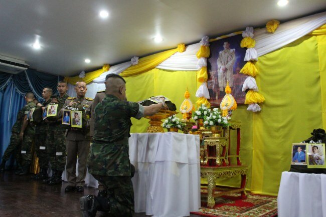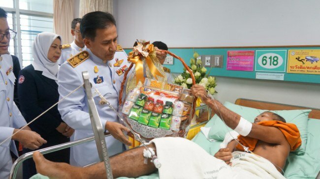 สมเด็จพระเจ้าอยู่หัวพระราชทานดอกไม้และตะกร้าแก่พระที่ได้รับบาดเจ็บจากคนร้ายบุกถล่มใ…